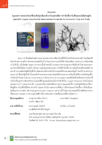 Agent29: คอปเปอร์ออกซี่คลอไรด์รูปเข็มระดับนาโนเมตรเพื่อการก าจัดเชื้อราในพืชและผลไม้เศรษฐกิจ Pro-Cal: ไบโอแคลเซียมจากกระดูกปลาทรายแดงเสริมวิตามินดี 3 บรรจุแคปซูล