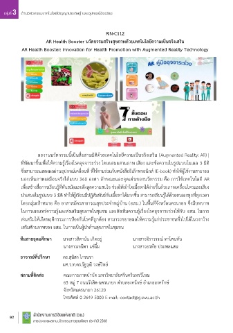 ผลงำนนวัตกรรมนี้เป็นสื่อสำมมิติด้วยเทคโนโลยีควำมเป็นจริงเสริม (Augmented Reality: AR) | กลุ่มเป้ำหมำยคือ นักกฬำ ผู้ปวย และประชำชนทวไป กำรใช้นวตกรรมนช่วยลดควำมเสี่ยงบำดเจ็บซ ำ กระตน