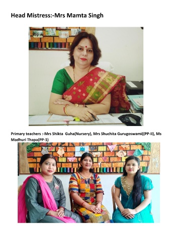 Head Mistress:-Mrs Mamta Singh Primary teachers :-Mrs Shikta Guha(Nursery), Mrs Shuchita Gurugoswami((PP-II), Ms Madhuri Thapa(PP-1)