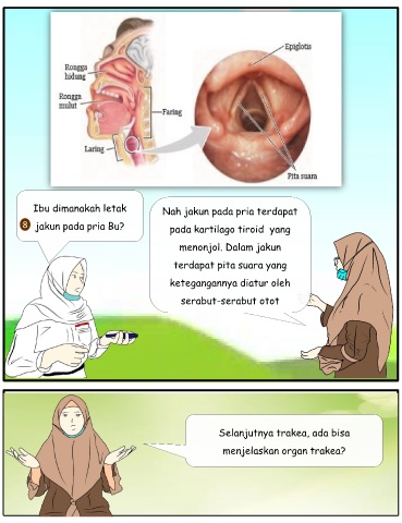 Ibu dimanakah letak Nah jakun pada pria terdapat 8 jakun pada pria Bu? pada kartilago tiroid yang menonjol. Dalam jakun terdapat pita suara yang ketegangannya diatur oleh serabut-serabut otot Selanjutnya trakea, ada bisa menjelaskan organ trakea?