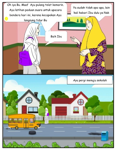 Oh iya Bu. Maaf Ayu pulang telat kemarin. Ya sudah tidak apa-apa, lain Ayu latihan paduan suara untuk upacara kali kabari Ibu dulu ya Nak bendera hari ini, karena kecapekan Ayu 2 langsung tidur Bu Baik Ibu Ayu pergi menuju sekolah