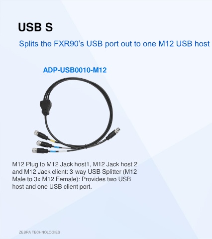Splits the FXR90’s USB port out to one M12 USB host port and one USB client port