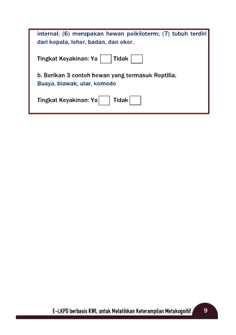 internal; (6) merupakan hewan poikiloterm; (7) tubuh terdiri dari kepala, leher, badan, dan ekor. Tingkat Keyakinan: Ya Tidak b. Berikan 3 contoh hewan yang termasuk Reptilia. Buaya, biawak, ular, komodo Tingkat Keyakinan: Ya Tidak 9