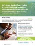 61st Street Service Corporation is committed to providing you with the best in benefit services. Our employee Benefits Portal will help you manage all aspects of your benefits elections. New Hire Enrollment We encourage you to read this step-by-step guide and connect to our employee Benefits Portal for more details about our plan program features, so you can make informed enrollment decisions and take full advantage of your benefits. You have 30 days from your date of hire to make benefit elections. Benefits will be effective 60 days from date of hire. What is a Qualified Life Event? A Qualified Life Event is a change in your situation or an event in your life that makes you eligible for a special enrollment period. For example; getting married, getting divorced, having a baby, or losing health coverage. Experiencing a Qualified Life Event will allow you to enroll in health insurance or make changes to your benefits outside the yearly Open Enrollment period. Employees have 31 days from the Qualified Life Event date to make elections directly through the Benefits Portal. . Let’s Get Started! 2 Benefits Enrollment Guide If you have any questions, please contact the Benefits Office. 212-326-3300 | Mon. – Fri. | 8 AM – 5 PM ET
