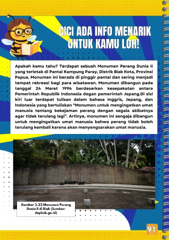 C I C I A D A I N F O M E N A R I K CICI ADA INFO MENARIK U N T U K K A M U L O H ! UNTUK KAMU LOH! Gambar 3.22 Monumen Perang Dunia II di Biak (Sumber: dephub.go.id) 91 9 1
