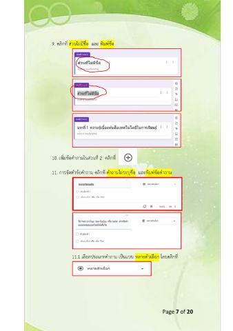 9. คลิกที่ ส่วนไม่มีชื่อ และ พิมพ์ชื่อ 10. เพิ่มข้อค าถามในส่วนที่ 2 คลิกที่ 11. การจัดท าข้อคาถาม คลิกที่ ค าถามไม่ระบุชื่อ และพิมพ์ข้อค าถาม 11.1 เลือกประเภทค าถาม เป็นแบบ หลายตัวเลือก โดยคลิกที่ Page 7 of 20
