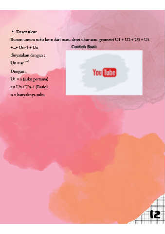 Deret ukur Rumus umum suku ke-n dari suatu deret ukur atau geometri U1 + U2 + U3 + U4 +...+ Un-1 + Un dinyatakan dengan : Un = ar n-1 Dengan : U1 = a (suku pertama) r = Un / Un-1 (Rasio) n = banyaknya suku 12