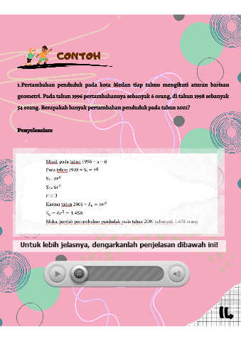 CONTOH 1.Pertambahan penduduk pada kota Medan tiap tahun mengikuti aturan barisan geometri. Pada tahun 1996 pertambahannya sebanyak 6 orang, di tahun 1998 sebanyak 54 orang. Berapakah banyak pertambahan penduduk pada tahun 2001? Penyelesaian: 14