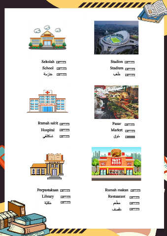 Sekolah Stadion School Stadium ْ ةسرْدم بعلم َ َ َ َ َ Rumah sakit Pasar Hospital Market ىفْشَتْسم قوُس ْ ُ Perpustakaan Rumah makan Library Restaurant ْ ْ ةَبَتكم معطم َ َ َ ْ فصقم َ َ