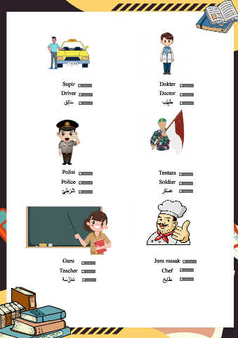 Supir Dokter Driver Doctor َ قِئاس بْيبط َ ِ Polisi Tentara Police Soldier يِط ْ رُش رَكْسع َ Guru Juru masak Teacher Chef َ ة س رَدم خباط ِ ُ ِ