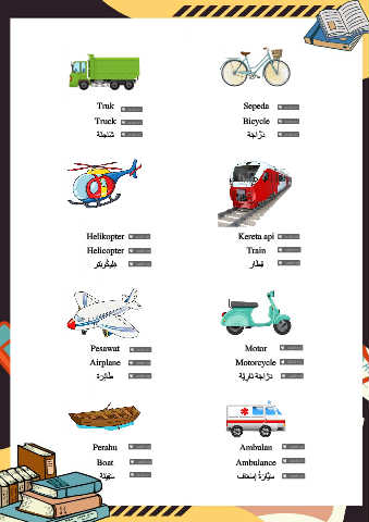 Truk Sepeda Truck Bicycle ةَن ِ حاَش ةجا َّ رَد َ Helikopter Kereta api Helicopter Train َ رِتْبوُكيِلِه راطِق Pesawat Motor Airplane Motorcycle َ َ ةرِئاط ةَّيران ةجا َّ رَد َ ِ َ Perahu Ambulan Boat Ambulance َ ةنْيِفس فاعْسإ ُةراَّيس َ َ َ َ ِ