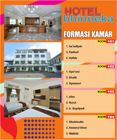 HOTEL HOTEL bhinneka SI KAMAR FORMA SI KAMAR FORMASI KAMAR FORMA ROOM 101 1. As’asfiyah 2. Fadholi 3. Hafidz ROOM 102 1. Sya’roni 2. Dhofir 3. Syamsuri ROOM 103 1. Alim 2. Nurul 3. A. Supriyadi ROOM 104 1. Sholehudin 2. Anwarul Ulum 3. Wakhid