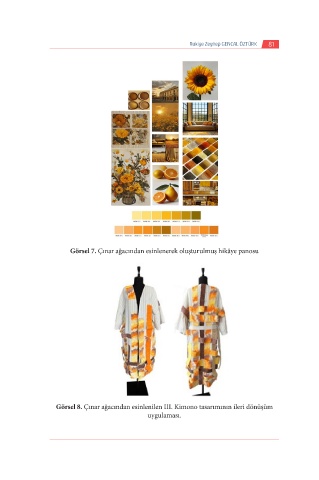 Rukiye Zeynep GENCAL ÖZTÜRK 81 Görsel 7. Çınar ağacından esinlenerek oluşturulmuş hikâye panosu Görsel 8. Çınar ağacından esinlenilen III. Kimono tasarımının ileri dönüşüm uygulaması.