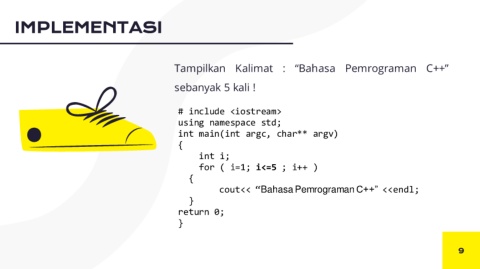 IMPLEMENTASI Tampilkan Kalimat : “Bahasa Pemrograman C++” sebanyak 5 kali ! # include <iostream> using namespace std; int main(int argc, char** argv) { int i; for ( i=1; i<=5 ; i++ ) { cout<< “Bahasa Pemrograman C++” <<endl; } return 0; } 9