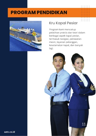PROGRAM PENDIDIKAN Kru Kapal Pesiar Program kami mencakup pelatihan praktis dan teori dalam berbagai aspek kapal pesiar, termasuk navigasi, perawatan mesin, layanan pelanggan, keselamatan kapal, dan banyak lagi. 11 aatc.co.id