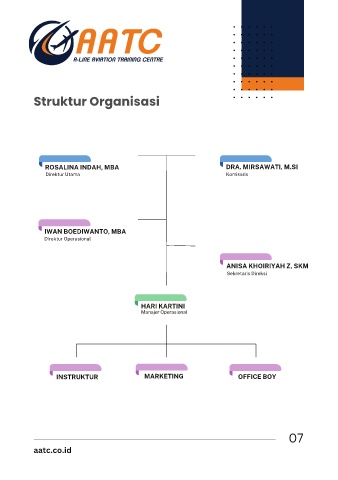Struktur Organisasi ROSALINA INDAH, MBA DRA. MIRSAWATI, M.SI Direktur Utama Komisaris IWAN BOEDIWANTO, MBA Direktur Operasional ANISA KHOIRIYAH Z, SKM Sekretaris Direksi HARI KARTINI Manajer Operasional INSTRUKTUR MARKETING OFFICE BOY 07 aatc.co.id