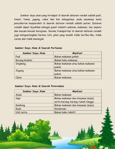 Sumber daya alam yang terdapat di daerah dataran rendah adalah padi,