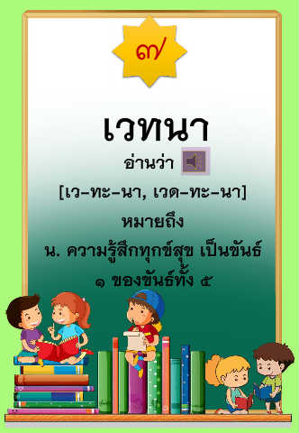 ๗ เวทนา อานวา [เว-ทะ-นา, เวด-ทะ-นา] ึ หมายถง น. ความรูสกทุกขสุข เปนขันธ ึ ๑ ของขันธทั้ง ๕