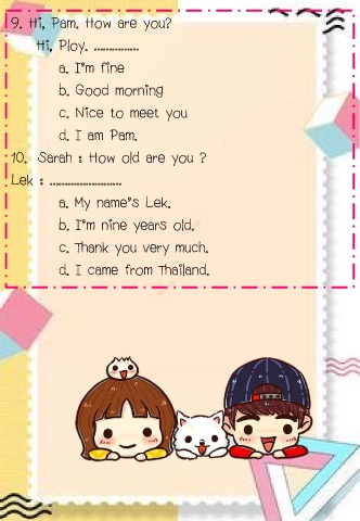 9. Hi, Pam. How are you? Hi, Ploy. …………… a. I’m fine b. Good morning c. Nice to meet you d. I am Pam. 10. Sarah : How old are you ? Lek : …………………… a. My name’s Lek. b. I’m nine years old. c. Thank you very much. d. I came from Thailand.