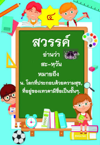 ๔ สวรรค อานวา สะ-หฺวัน ึ หมายถง น. โลกท่ประกอบดวยความสุข, ี ื ี ี ท่อยูของเทวดามช่อเปนชั้นๆ.