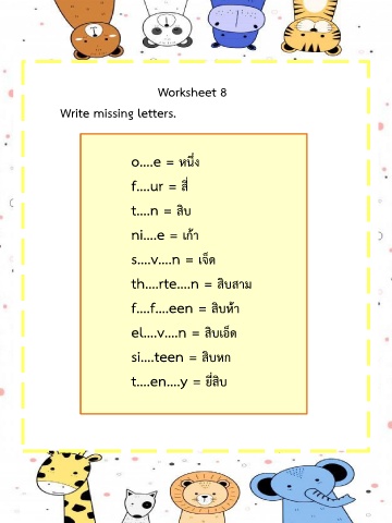 Worksheet 8 Write missing letters. o….e = หนึ่ง f….ur = สี่ t….n = สิบ ni….e = เก้า s….v….n = เจ็ด th….rte….n = สิบสาม f….f….een = สิบห้า el….v….n = สิบเอ็ด si….teen = สิบหก t….en….y = ยี่สิบ
