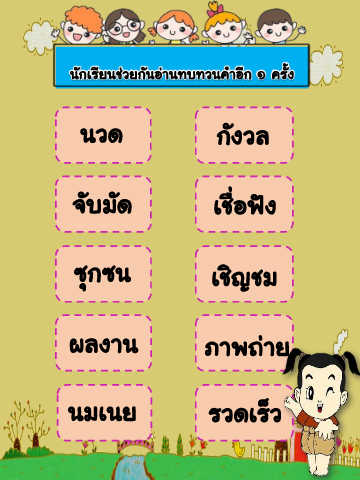 นักเรียนช่วยกันอ่านทบทวนค าอีก ๑ ครั้ง นวด กังวล จับมัด เชื่อฟัง ซุกซน เชิญชม ผลงาน ภาพถ่าย นมเนย รวดเร็ว