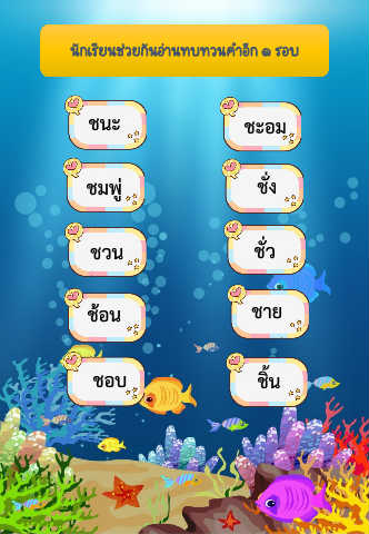นักเรียนช่วยกันอ่ำนทบทวนคำอีก ๑ รอบ ชนะ ชะอม ชมพ ู่ ชั่ง ชวน ชั่ว ช้อน ชาย ชอบ ชิ้น