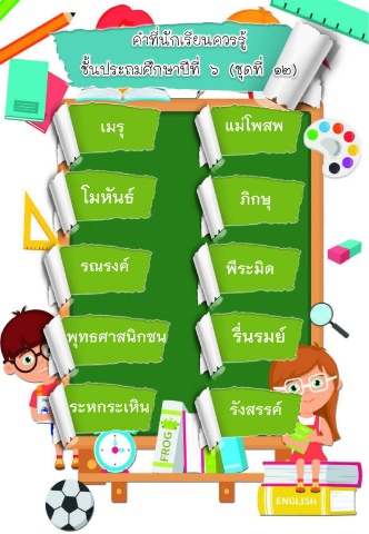 คําที่นักเรียนควรรู ชั้นประถมศึกษาปที่ ๖ (ชุดที่ ๑๒) เมรุ แมโพสพ โมหันธ ภิกษ ุ รณรงค พระมด ี ิ ื พุทธศาสนกชน ร่นรมย ิ ระหกระเหน รังสรรค ิ