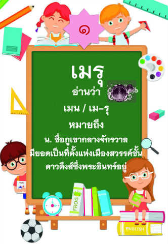 ๑ เมรุ อานวา เมน / เม-รุ หมายถง ึ น. ชอภูเขากลางจักรวาล ื่ ี มยอดเปนท่ตั้งแหงเมองสวรรคชั้น ื ี ดาวดงสซ่งพระอินทรอยู ึ ึ