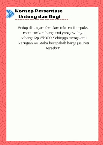 Konsep Persentase Untung dan Rugi Setiap diatas jam 9 malam toko rotii terpaksa menurunkan harga roti yang awalnya seharga Rp. 25.000. Sehingga mengalami kerugian 4%. Maka, berapakah harga jual roti tersebut?
