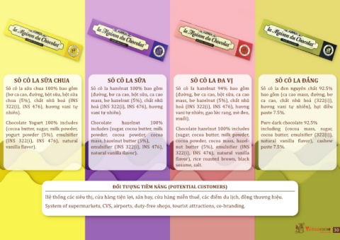 Sô cô la sữa chua 100% bao gồm Sô cô la hazelnut 100% bao gồm Sô cô la hazelnut 94% bao gồm Sô cô la đen nguyên chất 92.5%
