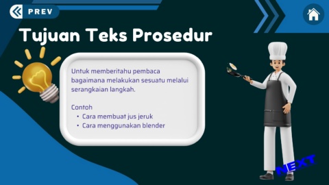 Tujuan Teks Prosedur Untuk memberitahu pembaca bagaimana melakukan sesuatu melalui serangkaian langkah. Contoh • Cara membuat jus jeruk • Cara menggunakan blender