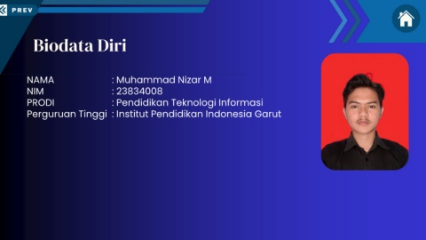 Biodata Diri NAMA : Muhammad Nizar M NIM : 23834008 PRODI : Pendidikan Teknologi Informasi Perguruan Tinggi : Institut Pendidikan Indonesia Garut