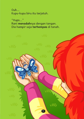 Ouh... Kupu-kupu biru itu terjatuh. “Hups...” Rani menadahnya dengan tangan. Dia hampir saja terhempas di tanah. 5 5