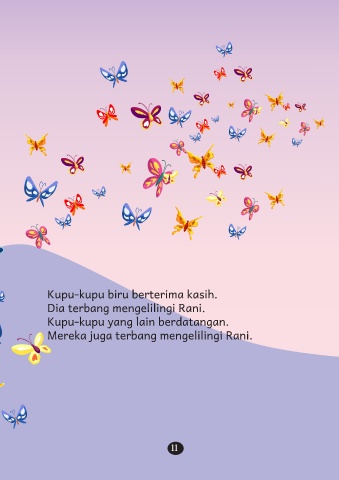 Kupu-kupu biru berterima kasih. Dia terbang mengelilingi Rani. Kupu-kupu yang lain berdatangan. Mereka juga terbang mengelilingi Rani. 11 11