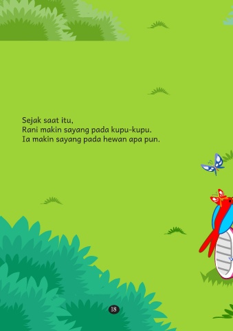 Sejak saat itu, Rani makin sayang pada kupu-kupu. Ia makin sayang pada hewan apa pun. 18 18
