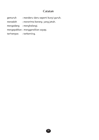 Catatan gemuruh : menderu-deru seperti bunyi guruh. menadah : menerima barang yang jatuh. mengadang : menghalangi. mengepakkan : menggerakkan sayap. terhempas : terbanting. 20