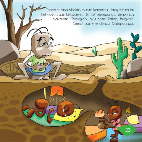 Tanpa terasa tibalah musim kemarau, Jangkrik mulai kehausan dan kelaparan. Ia tak mempunyai simpanan makanan, "Tolonglah.. aku lapar" Ratap Jangkrik. Semut pun mendengar Ratapannya. 23