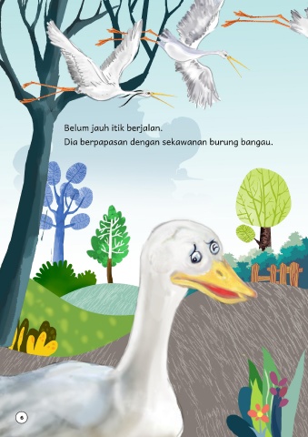 Belum jauh itik berjalan. Dia berpapasan dengan sekawanan burung bangau. 6