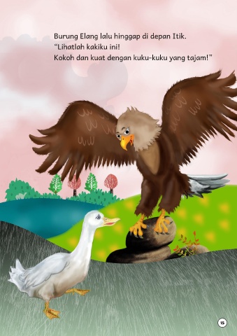 Burung Elang lalu hinggap di depan Itik. “Lihatlah kakiku ini! Kokoh dan kuat dengan kuku-kuku yang tajam!” 15