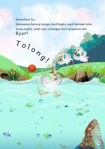 Sementara itu, Sekawanan burung bangau kecil begitu asyik bermain bola. Suatu ketika, salah satu si Bangau kecil terpeleset dan Byur! T o l o n g ! 19
