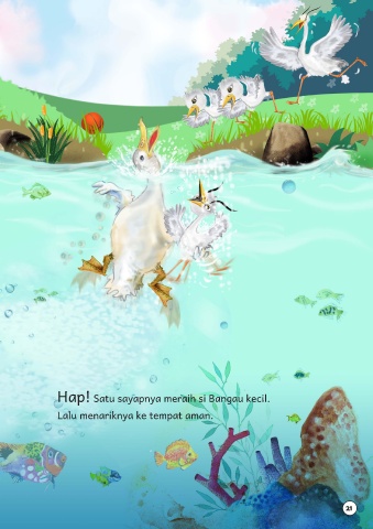 Hap! Satu sayapnya meraih si Bangau kecil.