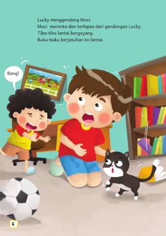 Lucky menggendong Moci. Moci meronta dan terlepas dari gendongan Lucky. Tiba-tiba lantai bergoyang. Buku-buku berjatuhan ke lantai. Bang! 6
