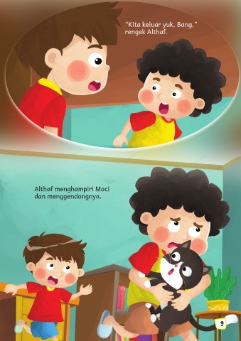 “Kita keluar yuk, Bang,” rengek Althaf. Althaf menghampiri Moci dan menggendongnya. 9