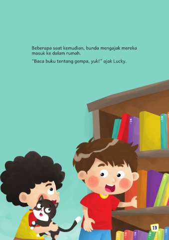 Beberapa saat kemudian, bunda mengajak mereka masuk ke dalam rumah. “Baca buku tentang gempa, yuk!” ajak Lucky. 13