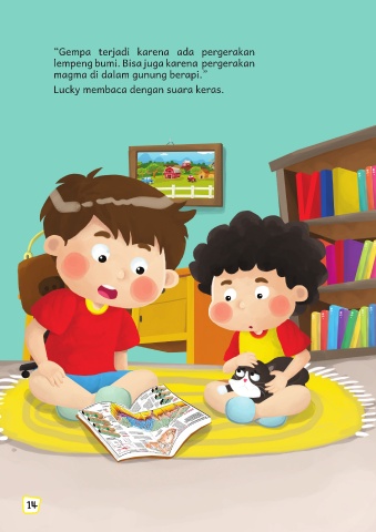 “Gempa terjadi karena ada pergerakan lempeng bumi. Bisa juga karena pergerakan magma di dalam gunung berapi.” Lucky membaca dengan suara keras. 14