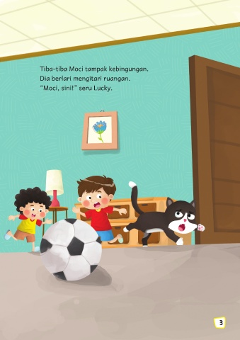 Tiba-tiba Moci tampak kebingungan. Dia berlari mengitari ruangan. “Moci, sini!” seru Lucky. 3