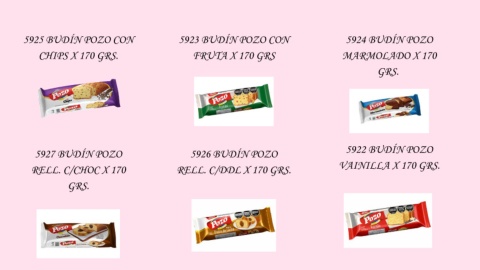 5925 BUDÍN POZO CON 5923 BUDÍN POZO CON 5924 BUDÍN POZO CHIPS X 170 GRS. FRUTA X 170 GRS MARMOLADO X 170 GRS. 5927 BUDÍN POZO 5926 BUDÍN POZO 5922 BUDÍN POZO VAINILLA X 170 GRS. RELL. C/CHOC X 170 RELL. C/DDL X 170 GRS. GRS.