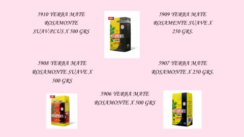 5910 YERBA MATE 5909 YERBA MATE ROSAMONTE ROSAMENTE SUAVE X SUAV.PLUS X 500 GRS 250 GRS. 5908 YERBA MATE 5907 YERBA MATE ROSAMONTE SUAVE X ROSAMONTE X 250 GRS. 500 GRS 5906 YERBA MATE ROSAMONTE X 500 GRS