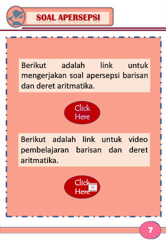 Berikut adalah link untuk mengerjakan soal apersepsi barisan dan deret aritmatika. Click Here Berikut adalah link untuk video pembelajaran barisan dan deret aritmatika. Click Here 7